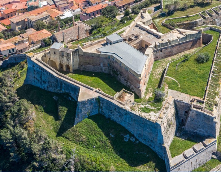 (Portoferraio .Al centro della immagine è Forte Falcone costruito nel 1548.Inserito all’interno della struttura cinquecentesca è visibile il tetto del museo della città di Portoferraio. Il museo percorre un periodo storico che va dal 1548 al 1737. E’ visibile anche il fosso secco che lo divide dal bastione della Carciofaia e del Serbelloni)
