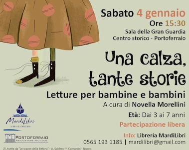 Sabato 4 gennaio alle ore 15.30 nella sala della Gran Guardia a Portoferraio si terrà “ Una calza, tante storie”. Lettura per bambini e bambine a cura di Novella Morellini, Dedicato ai bambini da 3 a 7 anni. La partecipazione è libera. Per informazioni, mardilibri@gmail.com o telefonare al 0565 193 1185. E’ prevista una merenda per tutti i partecipanti