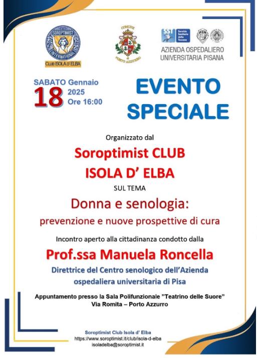 Sabato 18 gennaio il Soroptimist Club Isola d’Elba ha organizzato, a Porto Azzurro, un evento speciale sul tema “Donna e senologia – prevenzione e nuove prospettive di cura” condotto dalla professoressa Manuela Roncella, direttrice del centro senologico dell’Azienda ospedaliera universitaria di Pisa.