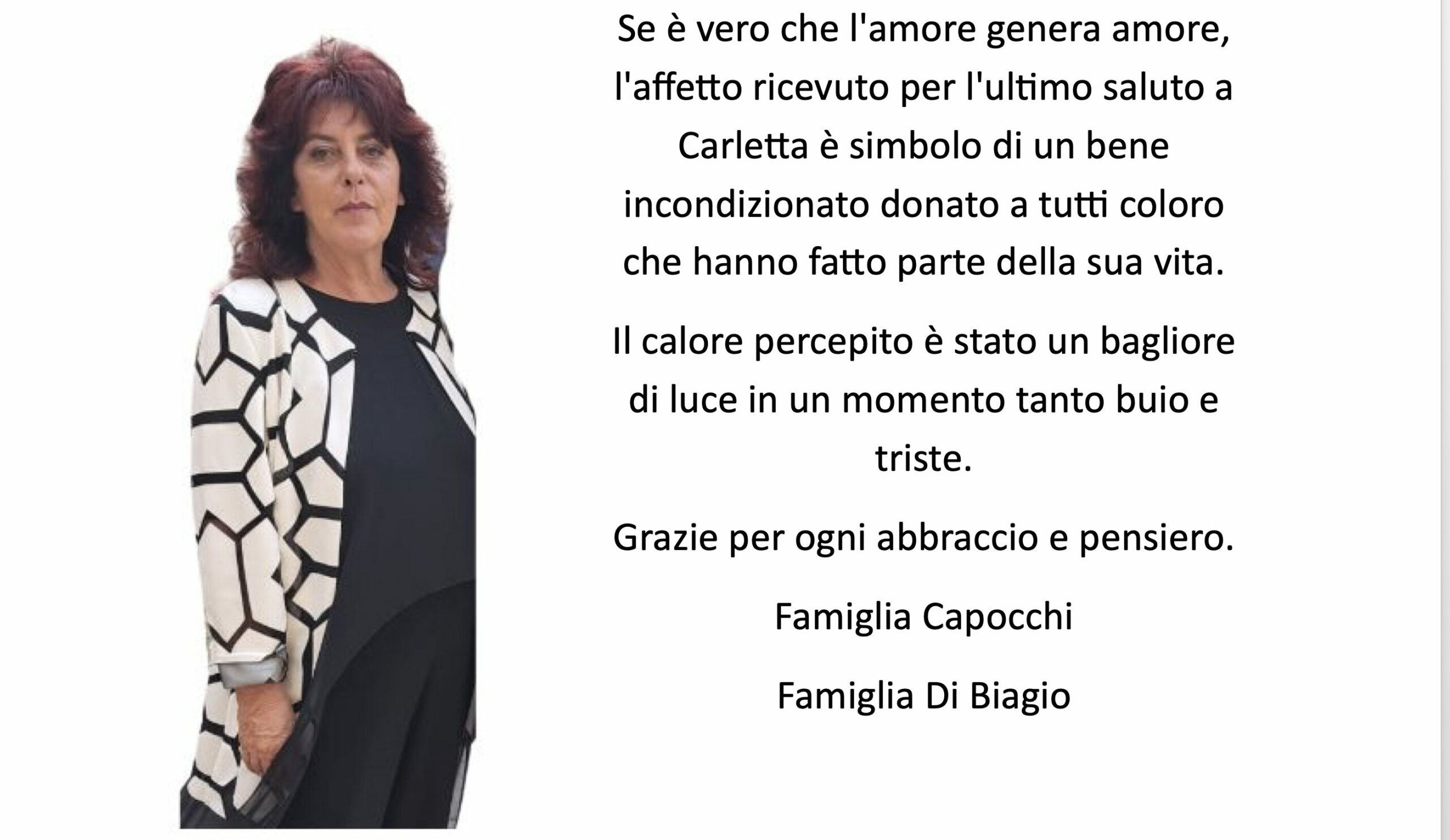 Se è vero che l’amore genera amore, l’affetto ricevuto per l’ultimo saluto a Carletta è simbolo di un bene incondizionato donato a tutti coloro che hanno fatto parte della sua vita. Il calore percepito è stato un bagliore di luce in un momento tanto buio e triste.