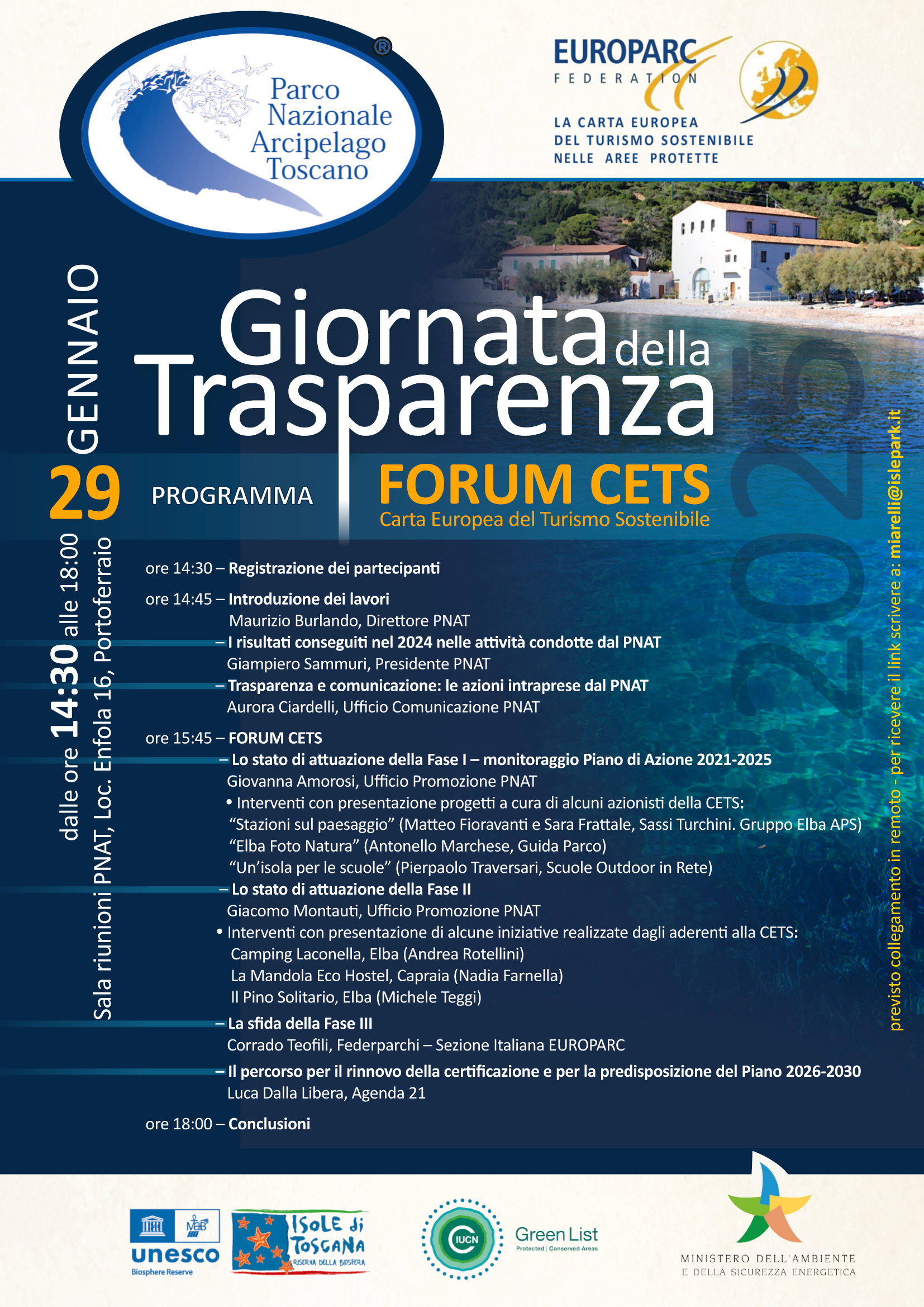 Come già annunciato nel comunicato del dicembre 2024 (https://www.islepark.it/2024/12/19/la-trasparenza-del-parco-nazionale-arcipelago-toscano/), l’Ente Parco Nazionale Arcipelago Toscano ha deciso di rinviare a gennaio 2025 l’appuntamento di fine anno dedicato alla Giornata della Trasparenza. Questo incontro si svolgerà in concomitanza con il Forum annuale per la Carta Europea del Turismo Sostenibile nelle Aree Protette (CETS).