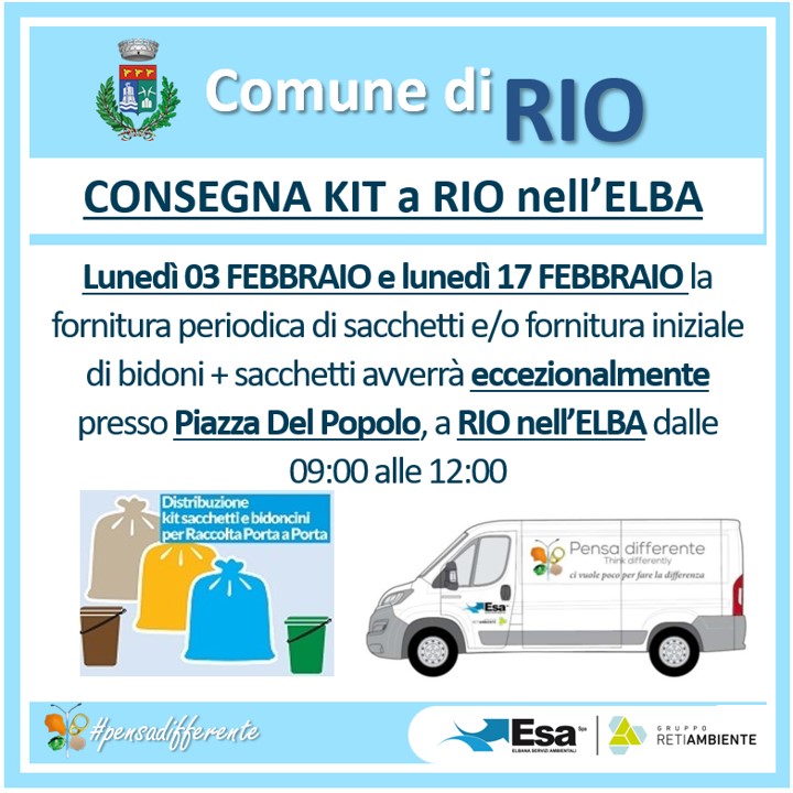 ESA informa che lunedì 3 febbraio e lunedì 17 febbraio, nel Comune di Rio, la consegna dei kit domestici (fornitura periodica sacchetti e/o fornitura iniziale bidoni + sacchetti) avverrà ECCEZIONALMENTE presso Piazza del Popolo, a Rio nell’Elba, dalle 09:00 alle 12:00.
