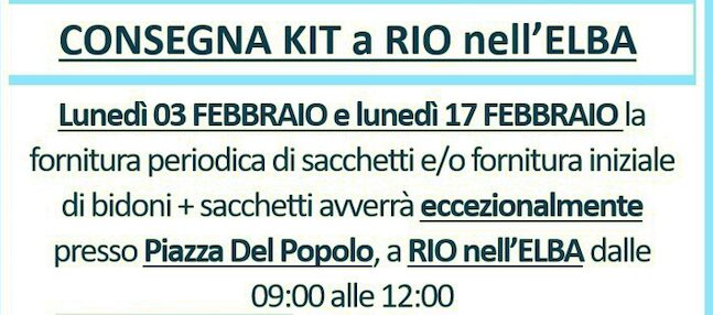 ESA informa che lunedì 3 febbraio e lunedì 17 febbraio, nel Comune di Rio, la consegna dei kit domestici (fornitura periodica sacchetti e/o fornitura iniziale bidoni + sacchetti) avverrà ECCEZIONALMENTE presso Piazza del Popolo, a Rio nell’Elba, dalle 09:00 alle 12:00.
