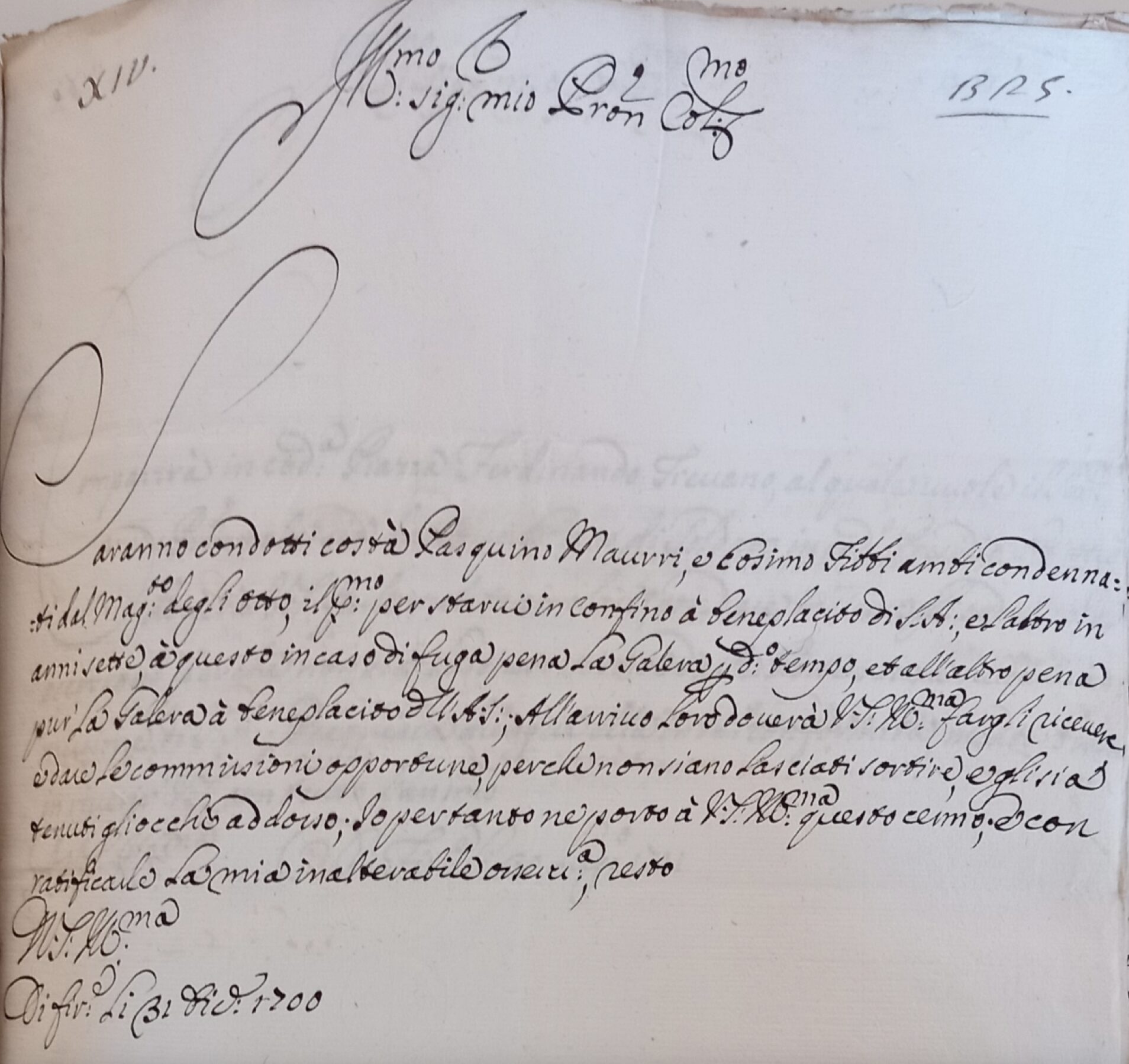 Saranno condotti costà Pasquino MaurrI e Cosimo Fibbi ambi condannati dal Magistrato degli Otto il primo per starvi al confino a beneplacito di S.A. e l’altro in anni sette ; a questo in caso di fuga pena la Galera per detto tempo et all’altro pure la Galera a beneplacito dell’A.S.