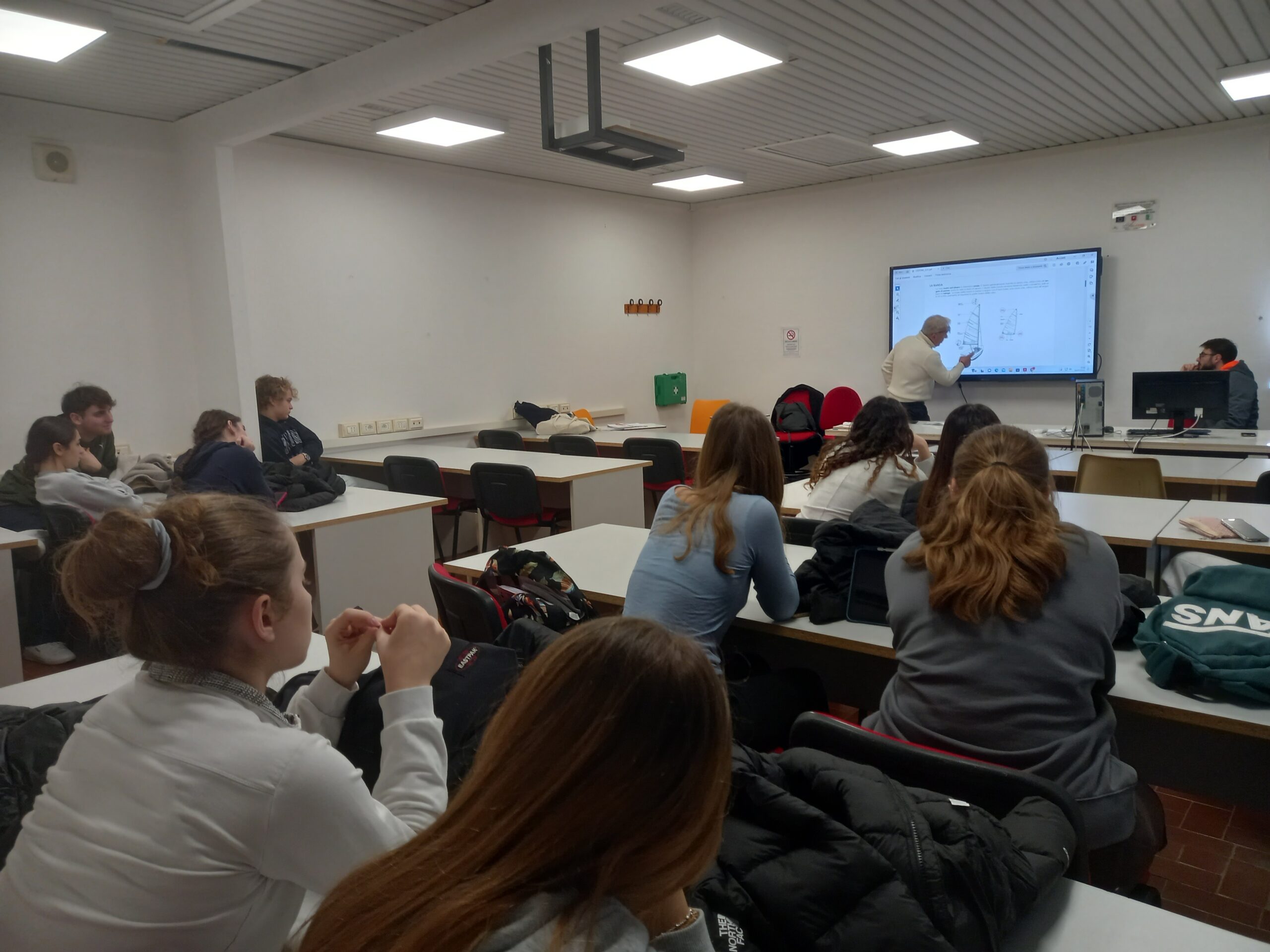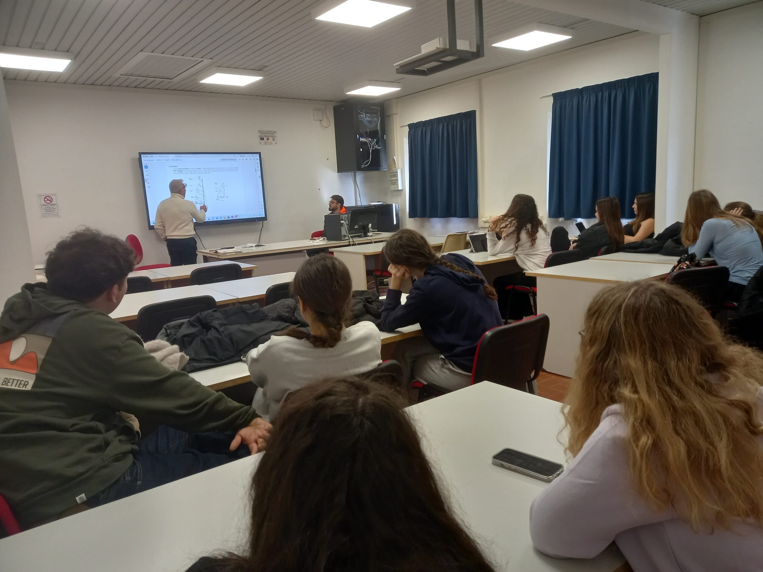 Il marinaio ha il piede “marino”, spiega Lello Sarperi. Perché? Tutti sono attentissimi in classe quando un esperto da tanto tempo come lui parla di vento e di mare. Racconta a questi giovani delle sue esperienze in regata e del perché un velista che regatava a Portoferraio ha detto che “questo golfo ha più versi di una poesia!”