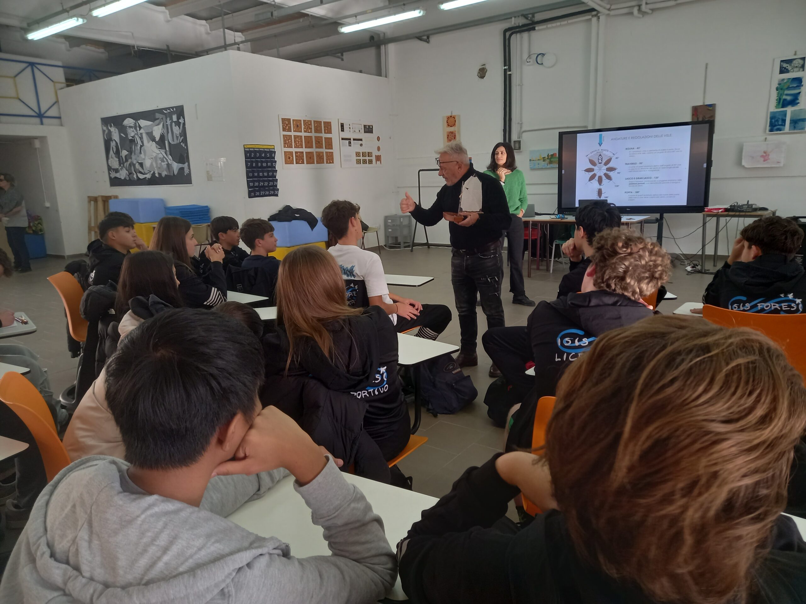 I ragazzi e le ragazze hanno sì la possibilità di basarsi sulle informazioni, le foto e i video proiettati sulla LIM da Francesca Gambelunghe, ma sono continuamente stimolati a ragionare, a seguire una lezione “poco tradizionale” del Professor Sarperi, che si muove fra i banchi degli studenti e delle studentesse spiegando in un modo travolgente e sempre fuori dagli schemi perché per esempio il vento reale e apparente è come quello percepito davanti a una porta aperta dove c’è corrente, o perché l’effetto Venturi è come il fluido che si muove come l’acqua che scorre lungo il dorso di un cucchiaio, per poi precipitare in modo verticale.