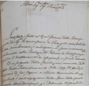 Ed in sequela della resoluzione emanata dal Senato Fiorentino ne 18() 1799 Vs Ill.ma si compiacerà di far saper a codesta comunità che per il rimborso o anticipazione delle spese delle quali si tratta deve dirigersi per i Detenuti Miserabili alle respettive Comunita alle quali appartengono i Detenuti medesimi e che sono in obbligo di pagarle per conto proprio o per conto della Cassa di questa Camera qualora le abbiano comprese nella loro Tassa di Redenzione e che per quanto alla Cibarie per i poveri e i miserabili dovrà essere tenuto l’istesso metodo che si pratica per gli altri simili Carcerati.