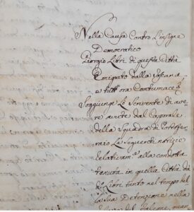 Nella causa contro l’insigne Democratico Giorgio Libri di questa Città emigrato dalla Toscana e tutt’ora contumace Soggiunge lo scrivente di avere avute dal Caporale della Squadra di Portoferraio le seguenti notizie relative alla condotta tenuta in quella città da detto Libri tanto nel tempo della sua detenzione nella Fortezza del Falcone quanto da che ne fu liberato all’invasione dei Francesi e che si trattenne libero in quel Porto.