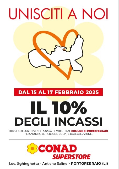 Nei giorni di sabato 15, domenica 16 e lunedì 17 febbraio, il 10% degli incassi del Conad Superstore di Portoferraio sarà devoluto al Comune di Portoferraio per aiutare le persone colpite dall’alluvione.