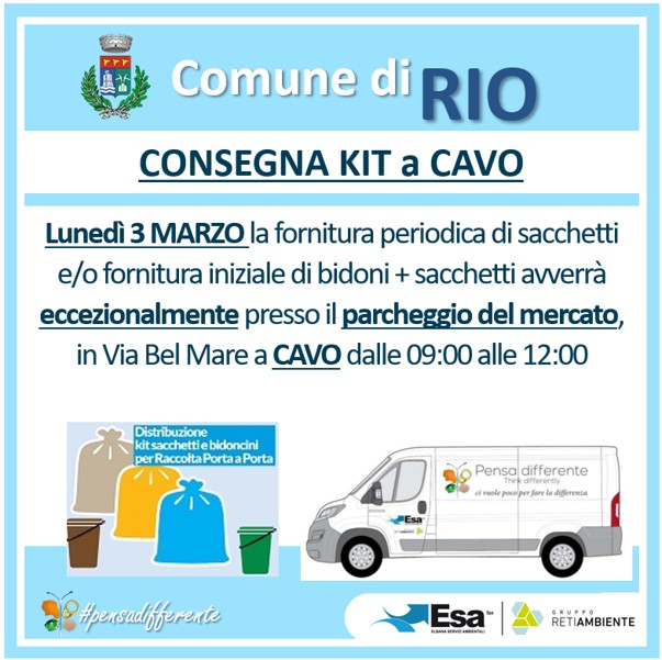 Lunedì 3 marzo, nel Comune di Rio, la consegna dei kit domestici (fornitura periodica sacchetti e/o fornitura iniziale bidoni + sacchetti)di Esa avverrà ECCEZIONALMENTE presso il parcheggio del mercato a CAVO, in Via Bel Mare, dalle 09:00 alle 12:00.