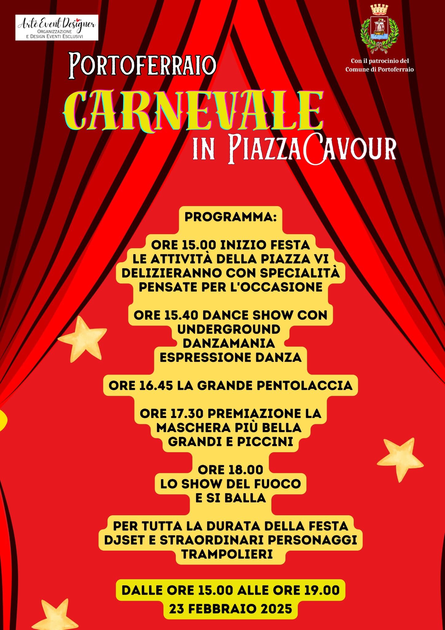 Portoferraio è pronta ad accendere i riflettori su un Carnevale che promette divertimento per tutti! Domenica 23 febbraio, dalle ore 15 alle ore 19, Piazza Cavour diventerà il cuore pulsante del divertimento per grandi e piccini. Artè Event Designer, di Alice Albertelli, con il patrocinio del Comune di Portoferraio, ha messo in piedi un evento da non perdere.