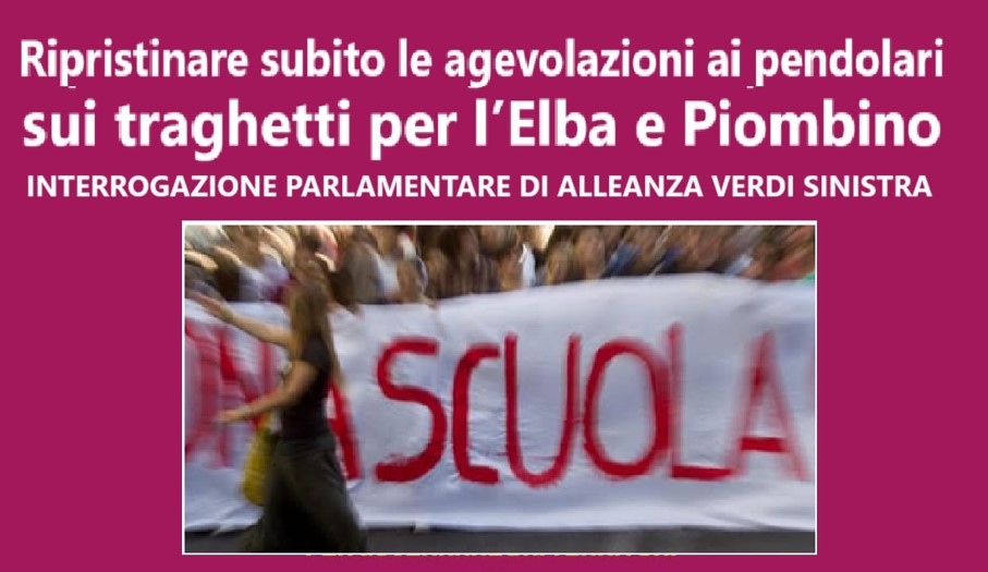 Il 28 gennaio, il Senatore si Sinistra Italiana – Alleanza Verdi Sinistra, Peppe De Cristofaro, presidente del Gruppo Misto ha presentato un’interrogazione ai Ministri delle infrastrutture e dei trasporti e dell’istruzione e del merito riguardante il taglio delle agevolazioni per i lavoratori pendolari per i traghetti che collegano Piombino e l’Elba, compreso  l’imbarco delle auto dei pendolari che non possono pagare costi aggiuntivi per poter svolgere il proprio lavoro. De Cristofaro evidenzia in particolare la situazione del personale scolastico docente e non docente ma la stessa situazione riguarda anche altre categorie ed è oggetto della manifestazione indetta dalla CGIL per il 21 Febbraio al porto di Portoferraio.