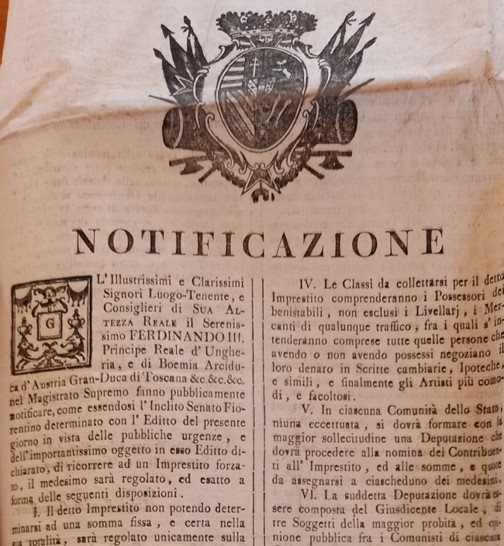 “L’Illustrissimi e Clarissimi Signori Luogo-Tenente e Consiglieri di Sua Altezza Reale il Serenissmo FERDINANDO III Principe Reale d’ Ungheria e di Boemia Arciduca d’Austria Gran-Duca di Toscana &c.&c.&c. nel magistrato supremo fanno pubblicamente notificare come essendosi l’inclito Senato fiorentino determinato con l’editto del presente giorno in vista delle pubbliche urgenze e dell’importantissimo oggetto in esso Editto dichiarato di ricorrere ad un impresto forzato il medesimo sarà regolato ed esatto a forma delle seguenti disposizioni …”