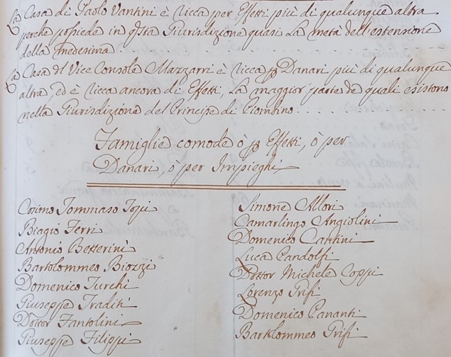 I possidenti benestanti della città chiedono di essere esentati dal pagamento. Quanti e quali fossero non sappiamo ma dalla relazione fatta pochi anni prima da Vincenzo degli Alberti vengono individua tele famiglie possidente benestanti :“…la casa di Paolo Vantini è ricca per effetti più di qualunque altra perché possiede in questa giurisdizione quasi la metà dell’estensione della medesima .La casa del viceconsole Mazzarri è ricca per danari più di qualunque altra ed è ricca ancora di effetti la maggior parte dei quali esistono nella giurisdizione del principe di Piombino