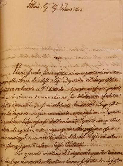 Non essendo stata fatta alcuna particolare attenzione alle preci di codesti signori Deputati all’imprestito fruttifero ordinato coll’Editto de 10 giugno prossimo passato colle quali domandavano che venisse totalmente assoluta codesta comunità e i suoi abitanti da un tale imprestito per le ragioni in essa comunicate non possono i deputati predetti dispensarsi dall’ordinato reparto con quelle vedute di equità e di proporzione che possono esserci più analoghe e coerenti all’indole del Paese ed alle circostanze particolari degli abitanti.