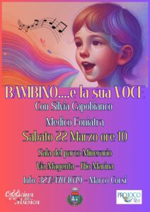 L'”Officina della Musica”, in collaborazione con il Comune e la Pro Loco di Rio, organizza per sabato 22 marzo, alle ore 10, presso la Sala del Parco Minerario di Rio Marina, in via Magenta, un incontro informativo intitolato “Il bambino… e la sua voce”, un’occasione per rivolgere l’attenzione sulla voce del bambino e le sue tante e varie sfumature.