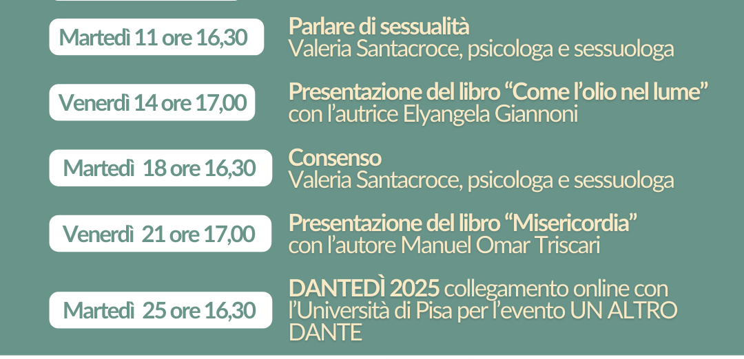 Ricca la programma zione del mese di marzo. Domani pomeriggio appuntamento con la dottoressa Valeria Santacroce che parla di sessualità