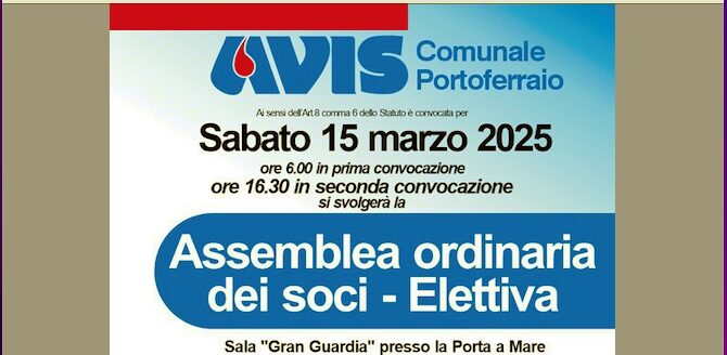 Sabato 15 marzo alle 16.00 presso la sala della Gran Guardia si svolgerà l’assemblea ordinaria elettiva dei soci Avis del comune di Portoferraio. Dopo la relazione del presidente ci sarà l’esame e l’approvazione previa relazione del revisore dei conti, del conto consuntivo per l’anno 2024. A seguire la pratica per l’approvazione del bilancio 2025, la nomina della commissione elettorale e l’elezione degli organi statutari. Infine la designazione dei delegati per l’assemblea zonale