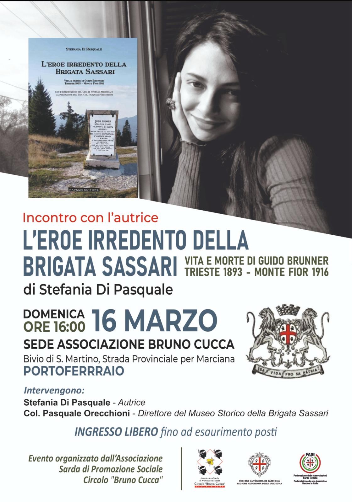 Domenica 16 marzo, alle ore 16:00, presso la Sede dell’Associazione Bruno Cucca a Portoferraio, si terrà un incontro con Stefania Di Pasquale, autrice del libro “L’eroe irredento della Brigata Sassari: Vita e morte di Guido Brunner (Trieste 1893 – Monte Fior 1916)”, edito da Ravizza Editore.