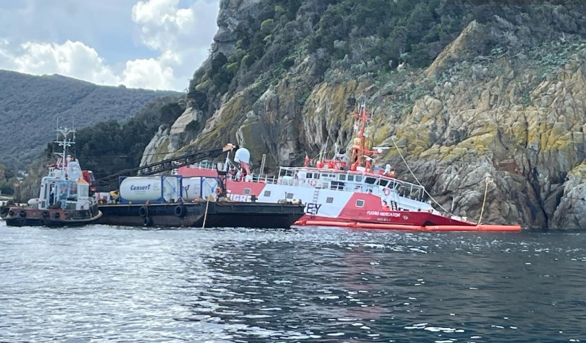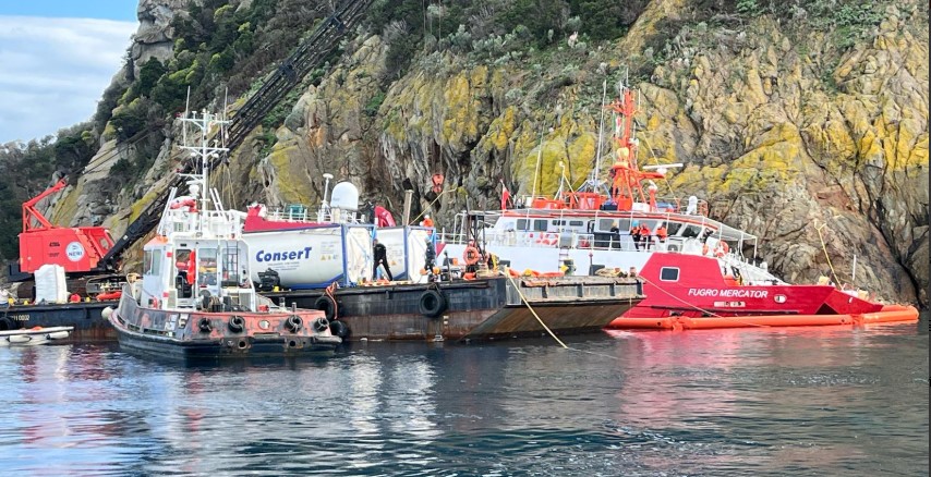 La società incaricata delle operazioni ha lavorato fin dalle prime luci dell’alba in una cornice di sicurezza garantita dalle unità navali della Guardia Costiera di Portoferraio. Sono stati impiegati operatori subacquei, un rimorchiatore e un pontone galleggiante, grazie ai quali è stato avviato lo svuotamento delle casse di bordo dal carburante – operazione che verrà conclusa mercoledì – e sono stati posizionati palloni galleggianti ad alta capacità per stabilizzare l’assetto della nave.