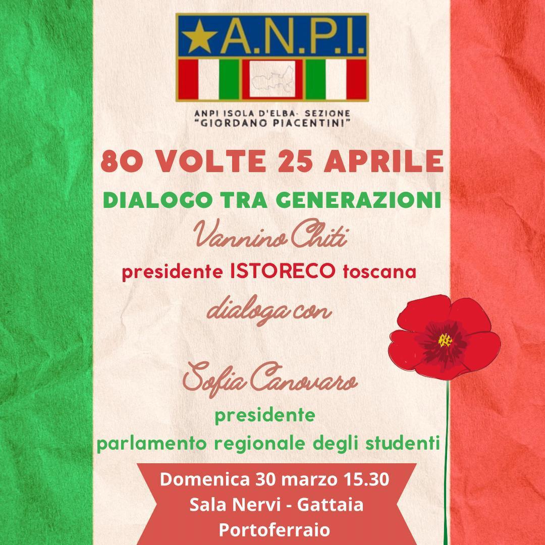 L’ANPI Isola d’Elba “Giordano Piacentini” vi invita domenica 30 marzo 2025 alle ore 15,30 presso la “Gattaia” di Portoferraio a un dialogo sulla Resistenza con Vannino Chiti, presidente dell’Istituto storico della Resistenza e della Contemporaneità della Toscana e Sofia Canovaro, presidente del Parlamento Regionale degli Studenti della Toscana. Il dialogo, moderato da Marco Ambra, sarà un confronto intergenerazionale sul significato storico, politico e morale della guerra partigiana e della Resistenza, nell’ottantesimo Anniversario della Liberazione dal nazi-fascismo. Vi attendiamo numerosi e numerose!