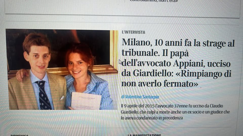 «Abbiamo sentito mia figlia, per chiederle di contattare Lorenzo, ma lui non rispondeva nemmeno a lei. Così ci siamo messi a chiacchierare al telefono e ci ha raccontato che aveva sentito di una notizia assurda, una sparatoria nel tribunale di Milano. Giardiello, un ex cliente di mia moglie, aveva sparato ad alcune persone e poi era stato arrestato prima che potesse colpire un altro uomo, uno dei suoi ex soci».