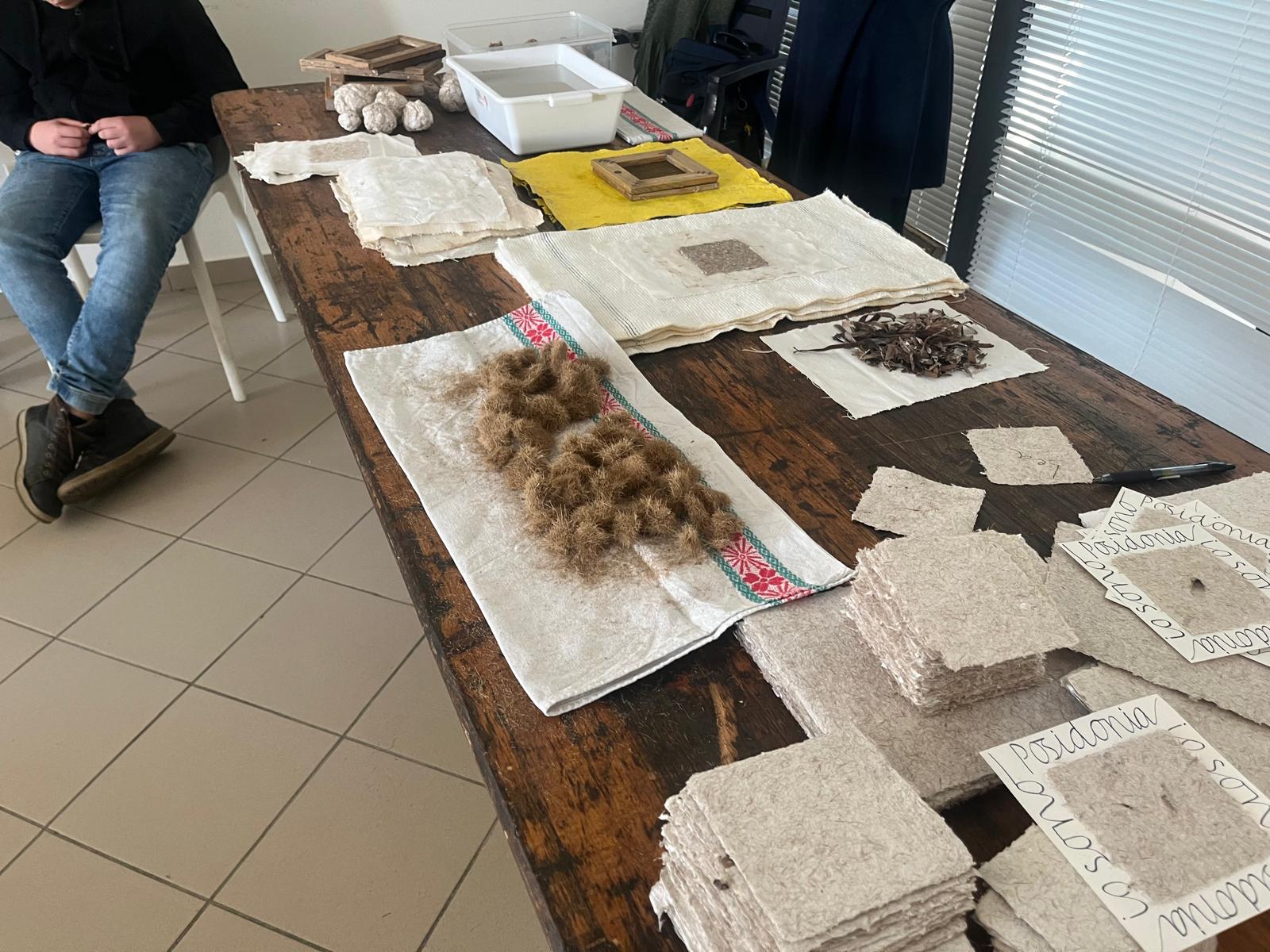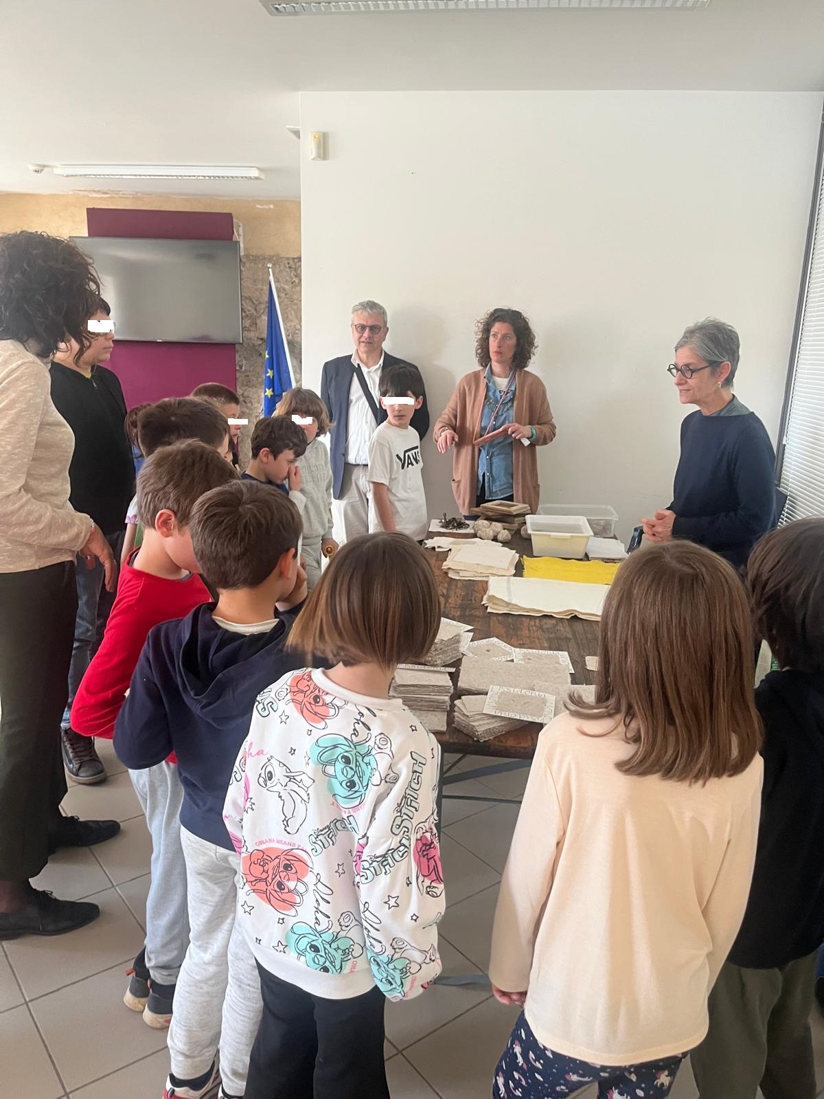 Sono arrivati in autobus da Porto Azzurro per partecipare al laboratorio sulla carta posidonia i 13 bambe e bimbi delle classi 2A e 2B della scuola Carducci di Porto Azzurro, condotti dalle insegnanti Simona Sabbioni e Marika Manzo: a scatola chiusa, le due insegnanti per scelta non avevano detto niente. Alla sala Infopoint i ragazzi hanno trovato la maestra cartaia Lea Bilanci, di fronte ad una tavola apparecchiata con palle di fibra di cellulosa bagnata, telai, panni, bacinelle e prototipi di carta artigianale: Lea ha mostrato, accompagnandosi con parole semplici, alle bimbe e a i bambini come sciogliere nell’acqua la posidonia, raccoglierla con piccoli telai e depositarla su un panno per asciugare. E intanto spiegava loro che cos’è la posidonia, cos’è la cellulosa, qual’è il valore del recupero delle materie prime seconde, l’importanza che ciascuno “faccia la sua parte”, con la favola africana del colibrì che cerca di spengere l’incendio con la poca acqua che può portare nel becco.