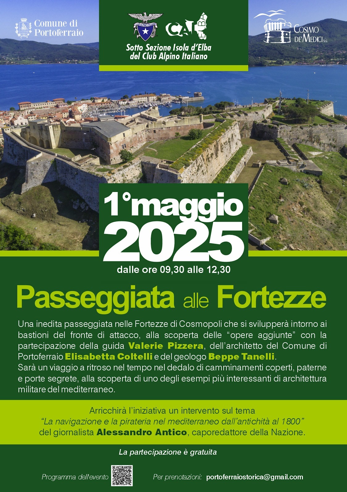 Passeggiata storica tra i bastioni di Portoferraio, il ritrovo 1° Maggio 2025 alle ore 9:30, presso la curva di via Giuseppe Ninci, in prossimità del Bastione di Santa Fine,Portoferraio.