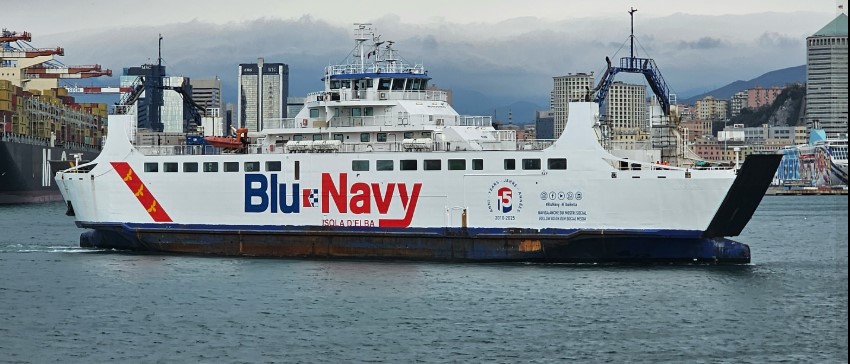 La nuova unità di Blunavy, la nuova “Aethalia” in movimento nel porto di Genova per lavori propedeutici all’immissione in linea con le insegne del suo nuovo armatore. La foto è della pagina facebook Navi e Armatori, e pare propedeutica a una prossima entrata in servizio sulla tratta Piombino – Portoferraio