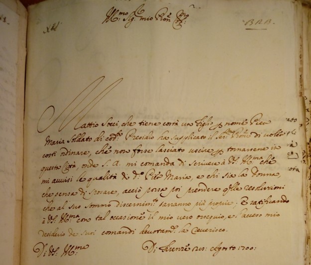 Matteo Socci che tiene costà un figlio per nome Pier Maria soldato in codesto presidio ha supplicato il Ser.mo Padrone di volergli costì ordinare che non fosse lasciato uscire per tornarsene in questa città onde S.A. R. mi comanda di scrivere a VS Ill.ma che mi avvisi le qualità di detto Pier Maria e chi sia la donna che pensa di sposare acciò poi forse prendere quelle resoluzioni al suo sommo discernimento saranno più proprie
