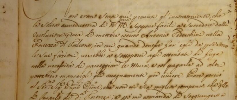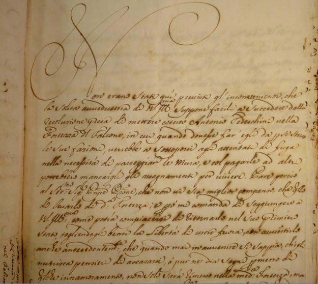 Non erano stati qui previsti gl’inconvenienti che la solita avvedutezza di VS Ill.ma suppone facili a succedere dalla resoluzione presa di mettere codesto Antonio Todeschini nella Fortezza del Falcone in cui quando dovesse egli fare da per se stesso le sue funzioni verrebbe a sottoporsi agli attentati di fuga nella necessità di guarnire le mura e col pagarle ad altri potrebbero mancargli gli() per vivere.