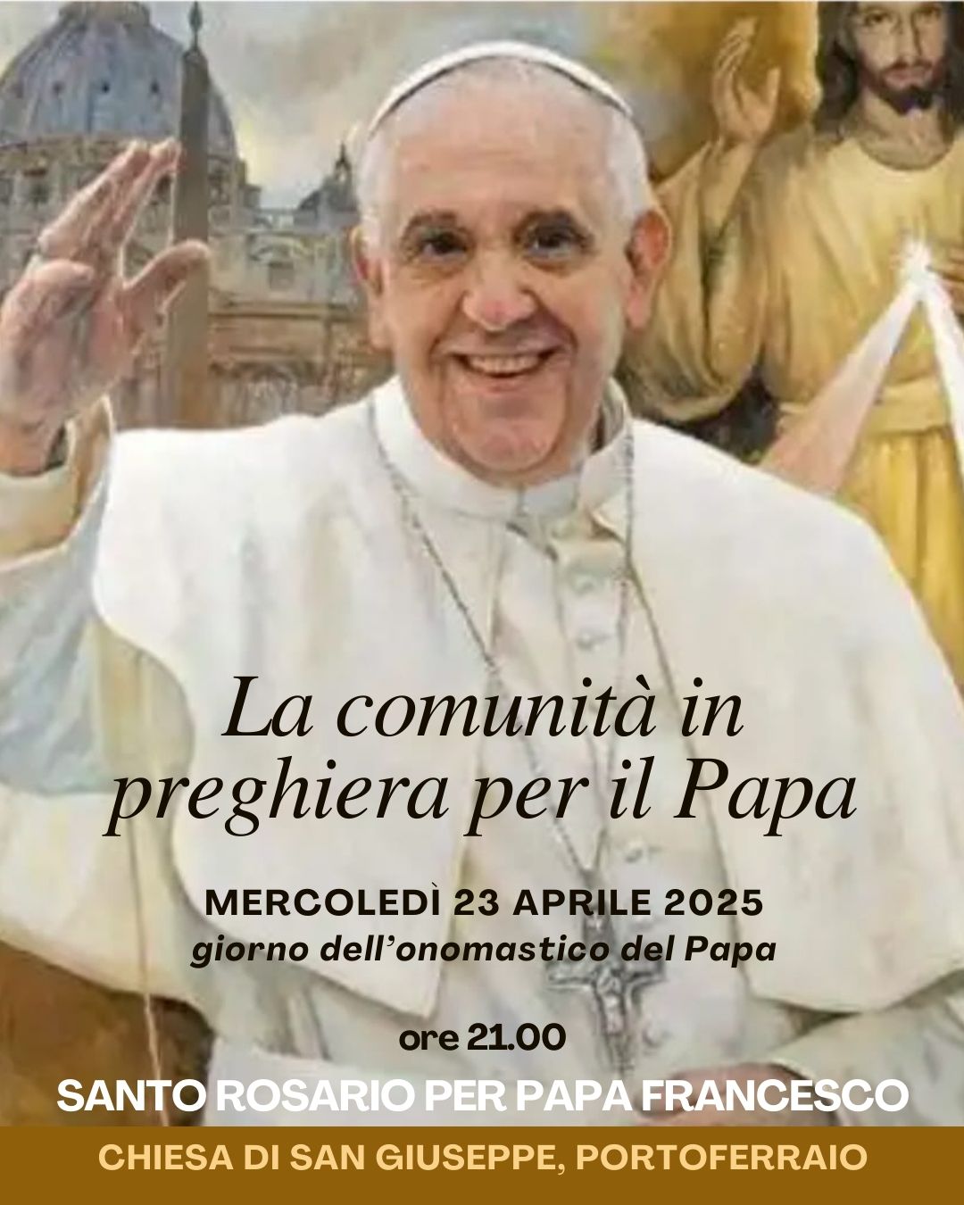 In comunione con la Chiesa universale, la Comunità Pastorale di Portoferraio si riunirà per pregare il Santo Rosario in suffragio del nostro caro Papa Francesco, giunto alla casa del Padre il lunedì di Pasqua. Questa preghiera comunitaria si terrà presso la chiesa di San Giuseppe, mercoledì 23 aprile, onomastico di Papa Francesco, il cui vero nome era Jorge (Giorgio), alle ore 21.00. Tutta la comunità è incoraggiata a partecipare a questo momento di preghiera fraterna.