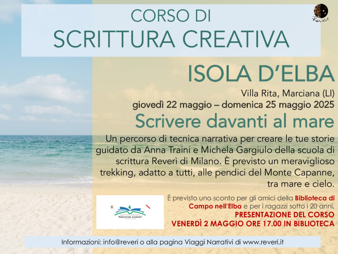 Venerdì 2 maggio, alle 17:00, presso la Biblioteca “Balestrini-Gentini” di Marina di Campo, sarà presentato il nuovo corso di scrittura creativa “Scrivere davanti al mare”, un percorso di tecnica narrativa guidato dalle autrici Anna Traini e Michela Gargiulo.