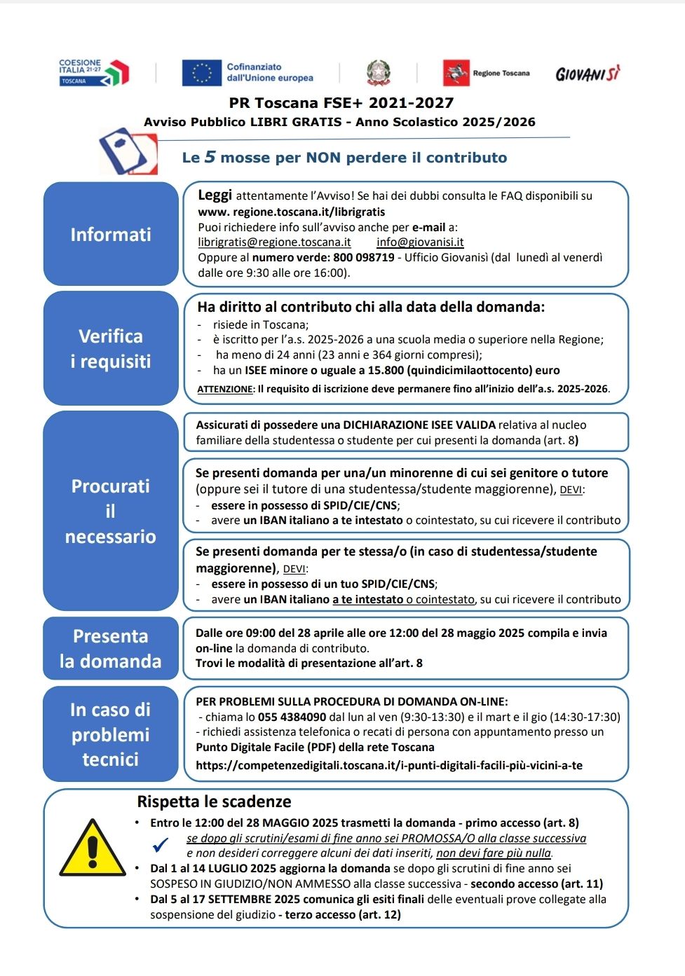 – iscritti all’a. s. 2025-2026 presso un istituto scolastico pubblico o paritario secondario di primo o secondo grado con sede in Toscana o in una regione confinante.