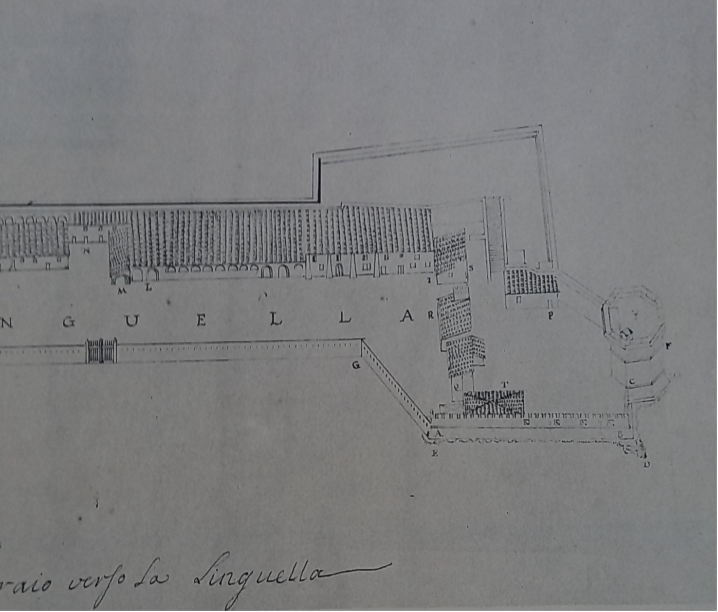 Nel particolare di una pianta della prima metà del settecento che porta il titolo “Distretto della Linguella con tutto il suo interno messo in prospettiva cavaliera” l’edificio sacro del chiesino appare nella legenda alla lettera Q col nome di “Chiesa detta la Madonna di Loreto tutta già resarcita” .E’ ubicato tra l’edificio del “Corpo di Guardia” (lettera R in legenda) e il “Magazzino tutto aperto per aver ceduto con la Muraglia “ (lettera T in legenda ).Tutti questi edifici insieme alla “Casa del Rais con suo Magazzino”(lettera IS in legenda)chiudono il piazzale della corte della Linguella sul lato di ponente.