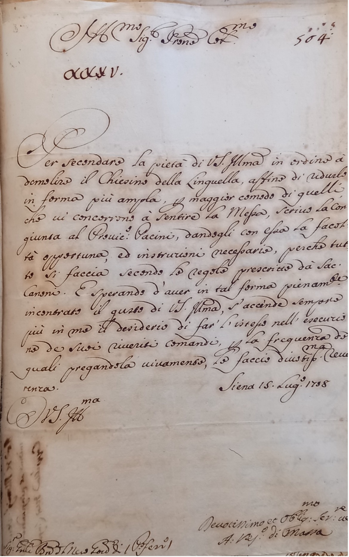 Ill.mo Signor Pron.mo Col.mo, Per secondare la pietà di VS Ill. ma in ordine a demolire il Chiesino della Linguella al fino di ridurlo in forma più ampia per maggior comodo di quelli che vi concorrono a sentire la Messa,servino la congiunta all’ing. Pacini dandogli con essa la facoltà opportuna ,ed istruzioni necessarie perché tutto si faccia secondo la regola prescritta dai sacri Canoni .E sperando d’aver in tal forma primariamente incontrato il gusto di VS Ill.ma ,s’accende sempre più in me il desiderio di far l’istesso nella esecuzione de suoi riveriti comandi, per la frequenza de quali pregandola vivamente,Io facco dinstistissima riverenza