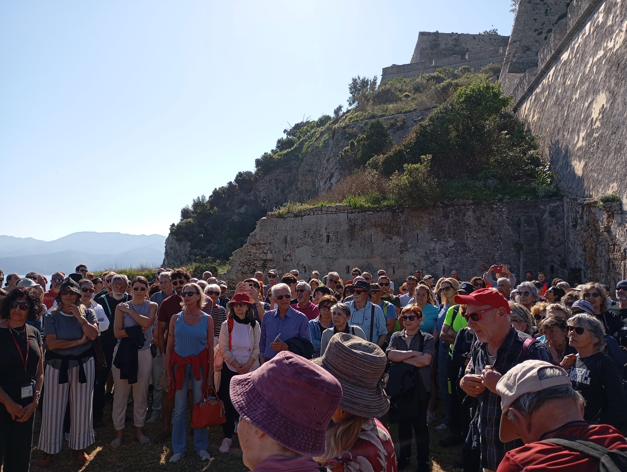 In una calda mattinata di sole, sotto l’organizzazione del Club Alpino Italiano S.S.Isola d’Elba e del Comune di Portoferraio, Assessorato all’ Ambiente, in collaborazione con la Cosimo de’ Medici e con le associazioni di volontariato portoferraiesi, la passeggiata ha attraversato tutti i luoghi più significativi delle Fortezze di Cosmopoli. La visita si è sviluppata intorno ai bastioni del Fronte di attacco, alla scoperta delle “opere aggiunte” in epoca lorenese (XVIII sec.) con la guida Valerie Pizzera e l’architetto del Comune di Portoferraio Elisabetta Coltelli, e con gli interventi del geologo e primo presidente del Parco Nazionale dell’Arcipelago Toscano Beppe Tanelli, del giornalista della Nazione Alessandro Antico e dell’esperto della Cosimo de’ Medici Luca Bellosi.