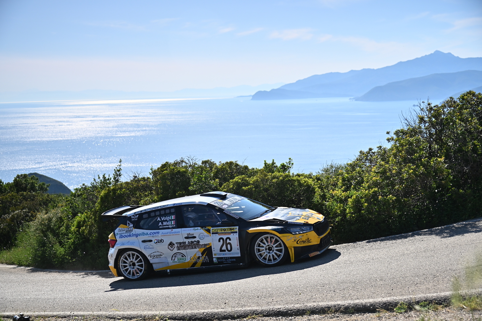 Alla mattina del venerdì, un principio di incendio alla vettura aveva fatto avviare l’avventura in salita, problema poi risolto dal team ed una volta in gara, per l’ambo di prove previste sono sorti altri problemi di natura tecnica. Il portacolori della Proracing ha dunque affrontato un inizio difficile al Rallye Elba, a causa di un malfunzionamento al sensore dei giri del motore. Nelle prime due prove speciali questo problema tecnico ha reso la Skoda a tratti ingovernabile, compromettendo la prestazione. Proprio con la vettura a tratti inguidabile, Volpi, durante la seconda prova è incappato in una ”toccata” che ha danneggiato il posteriore della Fabia, comunque riuscendo a concludere la prima giornata.