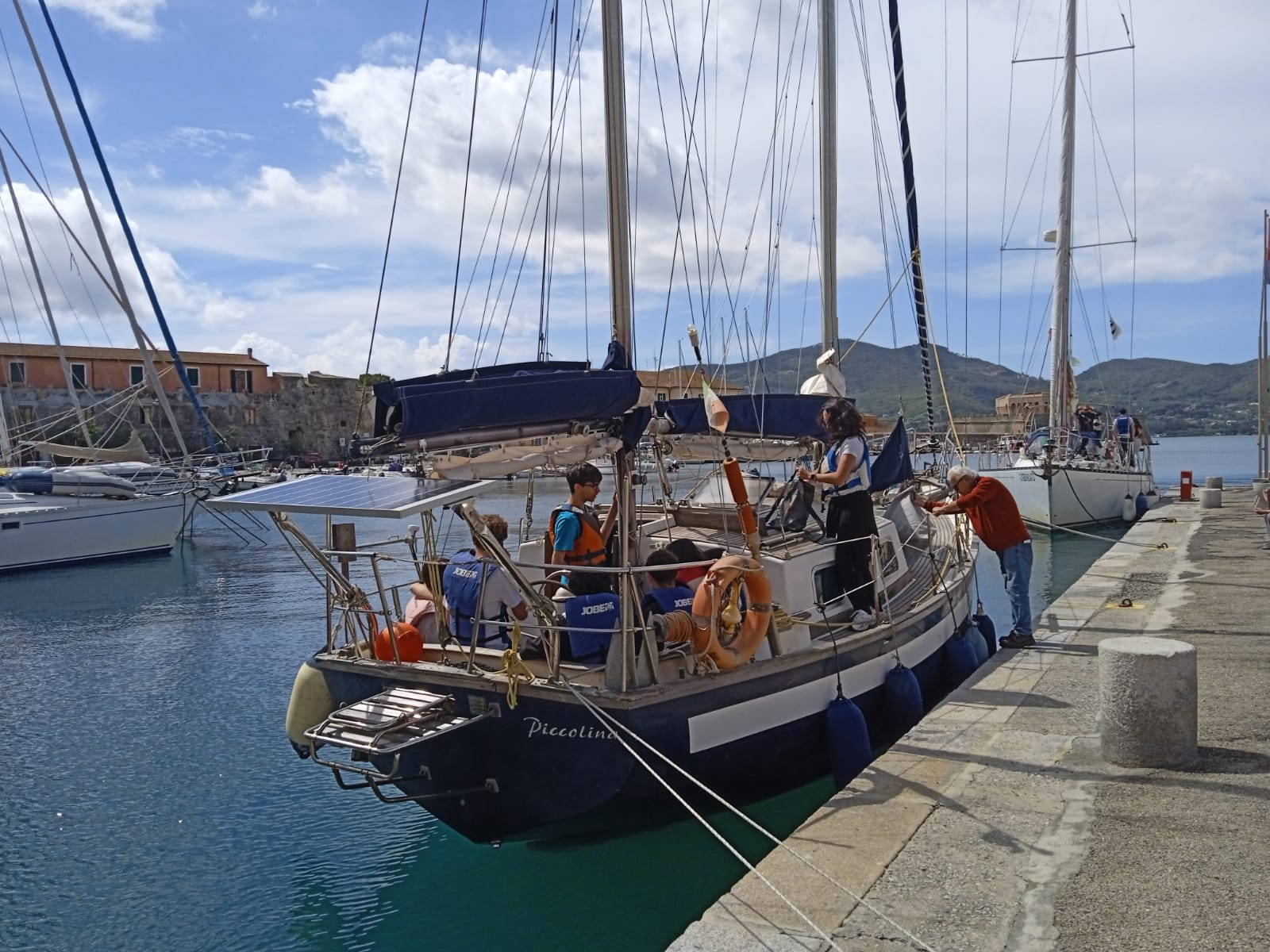Tre Armatori hanno messo a disposizione le loro imbarcazioni: il Socio LNI Luciano Colombaioni sempre gentile con la sua “Piccolina”, ha accolto in barca anche la Prof.ssa Simonetta Neto, Responsabile del progetto Vela a Scuola ITCG Cerboni in collaborazione con la Lega Navale Italiana per l’anno scolastico 2024-2025 e Marco Bulleri, istruttore LNI e FIV; Paolo Cappagli LNI armatore di “Cafe’ Doppio” ha ospitato a bordo Lorena Provenzali LNI; e Francesco Busalacchi, il bravo e competente skipper di “Bamboo”, una delle barche della Fondazione Exodus, coadiuvato dall’istruttore LNI FIV Renato De Michieli Vitturi, ha fatto bordeggiare in sicurezza – ma anche godendo del vento e del mare – ragazzi e e le ragazze della prima GRAF del Cerboni nella rada di Portoferraio.