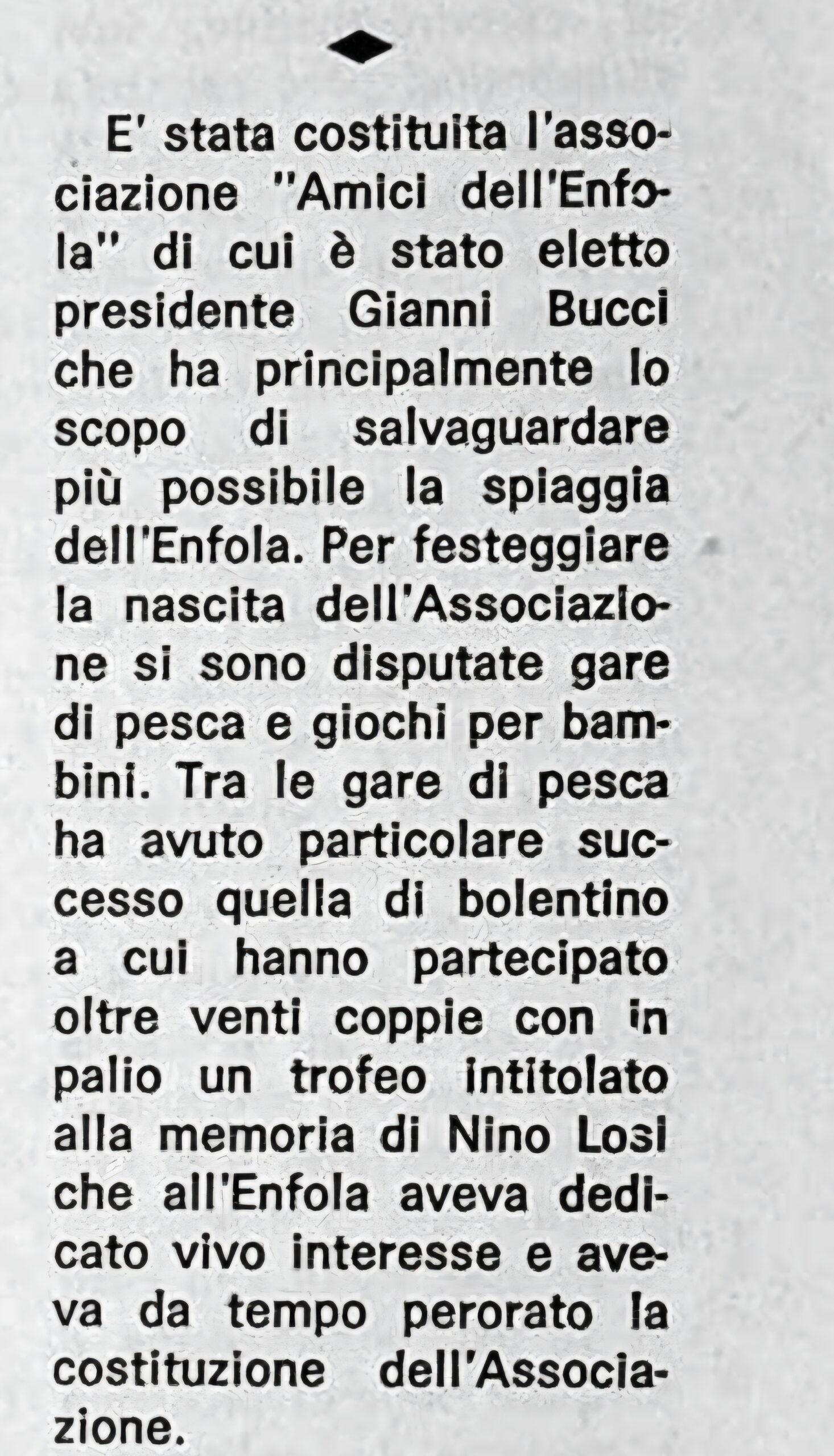 Babbo Renato, per voi Renato, fondò questa associazione insieme a poche, pochissime persone fidate che come lui condividevano gli ideali di onestà, di solidarietà, di collaborazione, di giustizia, di volontariato, che volevano battersi per rendere migliore questo mondo e per cambiare, nel loro piccolo, quello che ritenevano sbagliato, soprattutto per lasciare ai figli ed ai loro nipoti un posto incantevole nel quale vivere. Ed il nome che scelsero per questa associazione fu proprio ‘Amici dell’Enfola’ perchè loro AMICI lo erano davvero. Le ricordo, con mio fratello, lui ed io piccoli bambini, le serate passate ad ascoltarli durante le riunioni per decidere cosa fare per rendere più pulita la nostra spiaggia del cuore, per organizzare le gare di bolentino ed i giochi sull’acqua che tanto amavamo e prima ancora, prima di tutto, ricordo quanto tempo passavano a pensare ed a lavorare per riuscire a rendere l’Enfola quella che ancora oggi è, la spiaggia più bella! Ricordo quando passeggiavamo, la sera con i miei cugini, da casa nostra all’Enfola e trovavamo per strada lo sporco lasciato dai camper, ricordo che gli stessi camper apparecchiavano tende e tendine nel parcheggio non permettendo agli altri di godersi la spiaggia di tutti. E ricordo quando gli Amici dell’Enfola dopo sere, giornate e nottate passate a cercare una soluzione, decisero di mettere le barriere all’ingresso del parcheggio per non far entrare i camper. Ricordo: ‘Facciamole così, facciamole cosà, a questa altezza ma che si possano aprire per le emergenze, con una bella scritta Enfola 90’. Ricordo l’impegno e la precisione nel dipingere a mano, a pennello, quella scritta. Ricordo le saldature e le incazzature ogni volta che qualche turista sbadato ( o anche qualche residente) le rompeva andandoci a sbattere con le biciclette sopra il tetto della macchina. Ma gli Amici dell’Enfola ‘aggiustatutto’ una soluzione la trovavano sempre. Ricordo quanto il mio babbo, con i suoi Amici, si arrabbiava quando le barche venivano con il motore acceso fino a riva in mezzo ai bagnanti e mentre noi bambini giocavamo felici nell’acqua. Ma gli Amici dell’ Enfola una soluzione la trovavano sempre. E allora decisero di mettere le corsie, tutti insieme, tutti d’accordo nonostante le mille difficoltà burocratiche. Ma gli Amici dell’Enfola non si sono mai arresi. Magari a volte litigavano pure tra loro a parole perché uno la pensava in un modo ed uno in un altro. Ma poi, come i bambini, facevano la pace e tornavano uniti perchè il loro unico interesse era rendere l’Enfola il paradiso che grazie a loro oggi è diventato. Ricordo le gare di bolentino la domenica mattina, coppie di nonni e nipoti, di padri e figli, di fratelli e di amici partecipare contenti e agguerriti per potersi accaparrare il premio del ‘pesce più grande’ o anche quello del ‘pesce più piccolo’ e la trepidante attesa prima di conoscere il verdetto della bilancia per sapere chi aveva pescato di più.