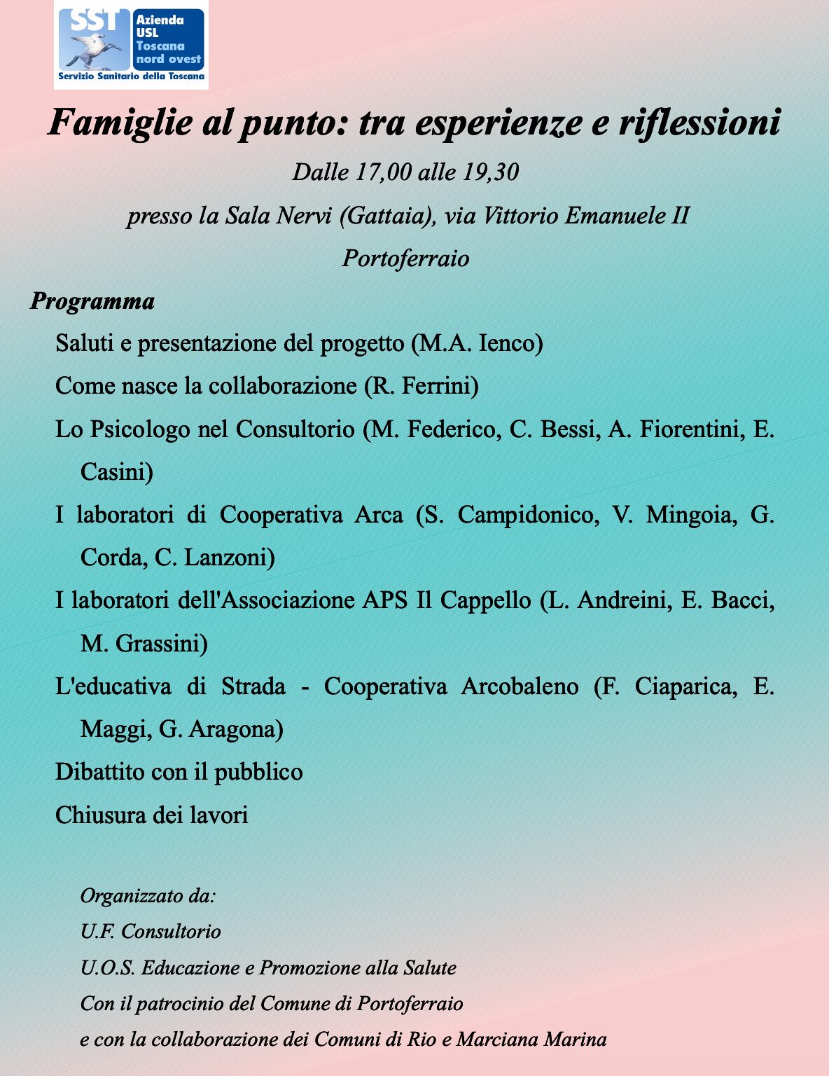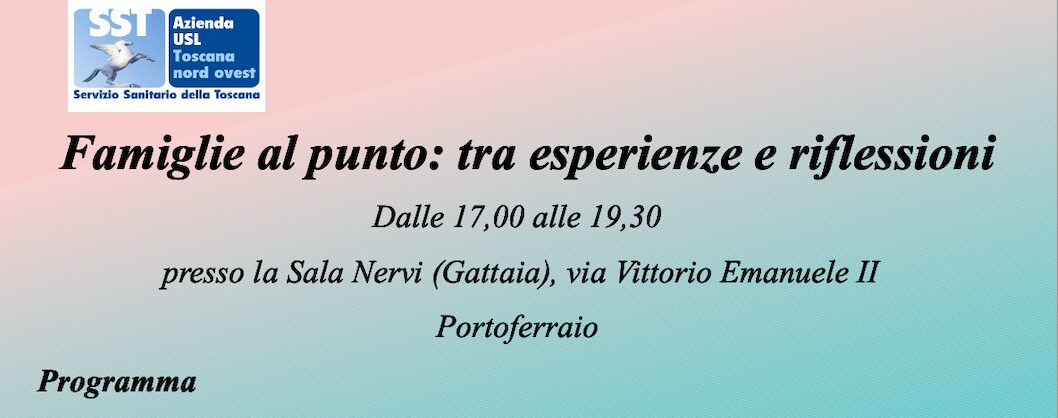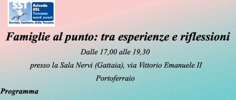 Si terrà venerdì 16 maggio, a partire dalle 17, presso la Sala Nervi (ex Gattaia) in via Vittorio Emanuele II, a Portoferraio, l’incontro dal titolo “Famiglie al punto: tra esperienze e riflessioni”, organizzato dalla Zona Elba, con il patrocinio del Comune di Portoferraio.
