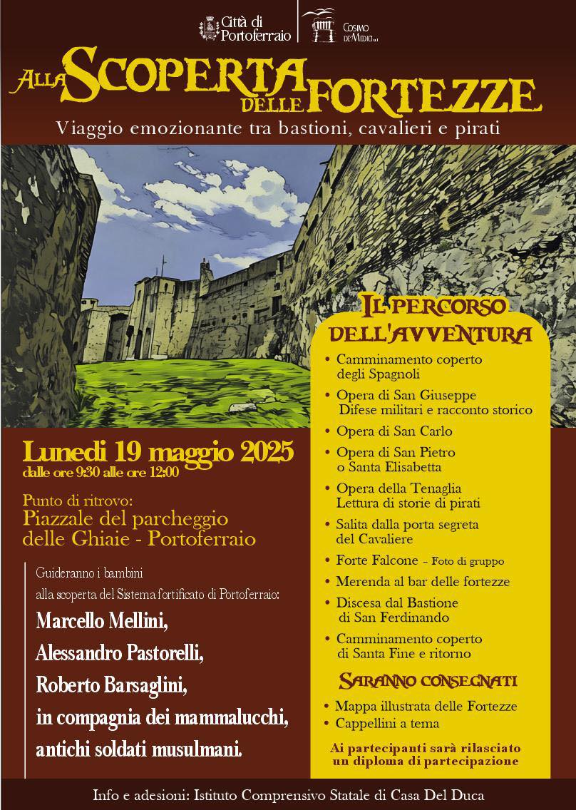 “Portiamo i nostri bambini a scoprire le Fortezze e la storia di Portoferraio”. L’ Assessorato all’Ambiente e quello all’Istruzione del Comune di Portoferraio, assieme al CAI, sottosezione dell’Isola d’Elba, e con la collaborazione della società partecipata Cosimo de’ Medici, organizzano per la giornata di Lunedì 19 maggio una passeggiata all’interno delle fortezze medicee per i bambini delle scuole primarie di classe quarta e quinta aderenti all’iniziativa.
