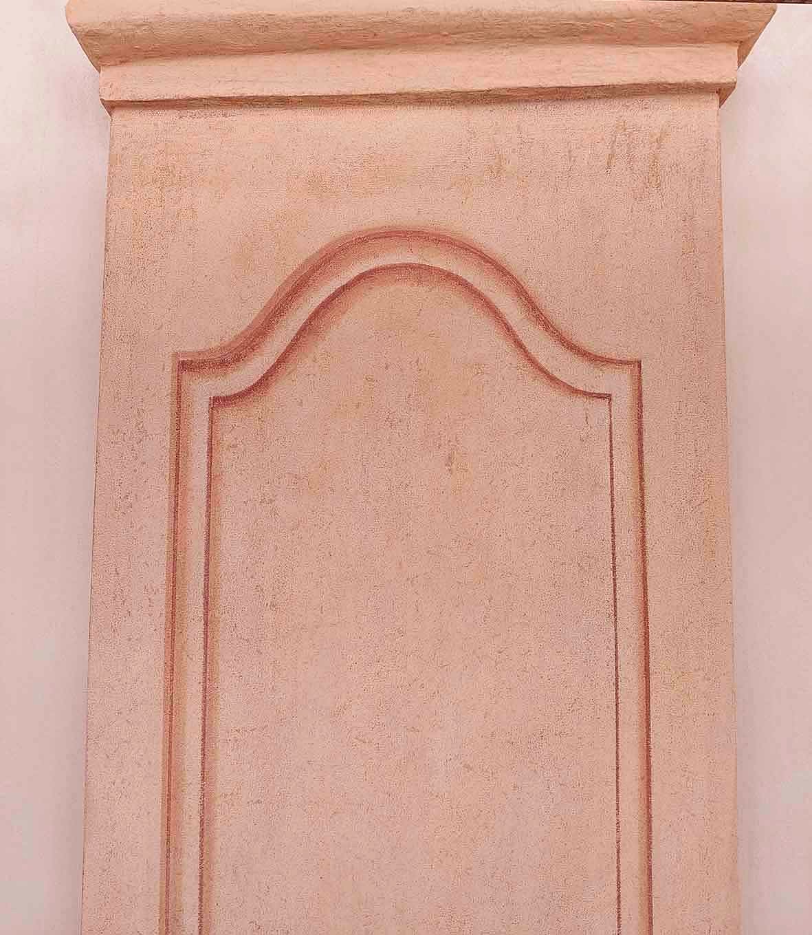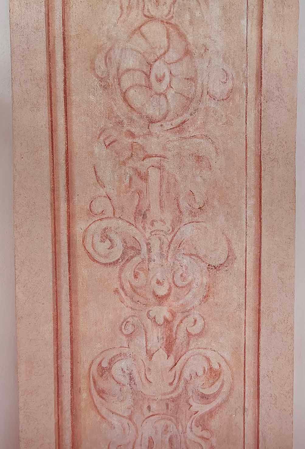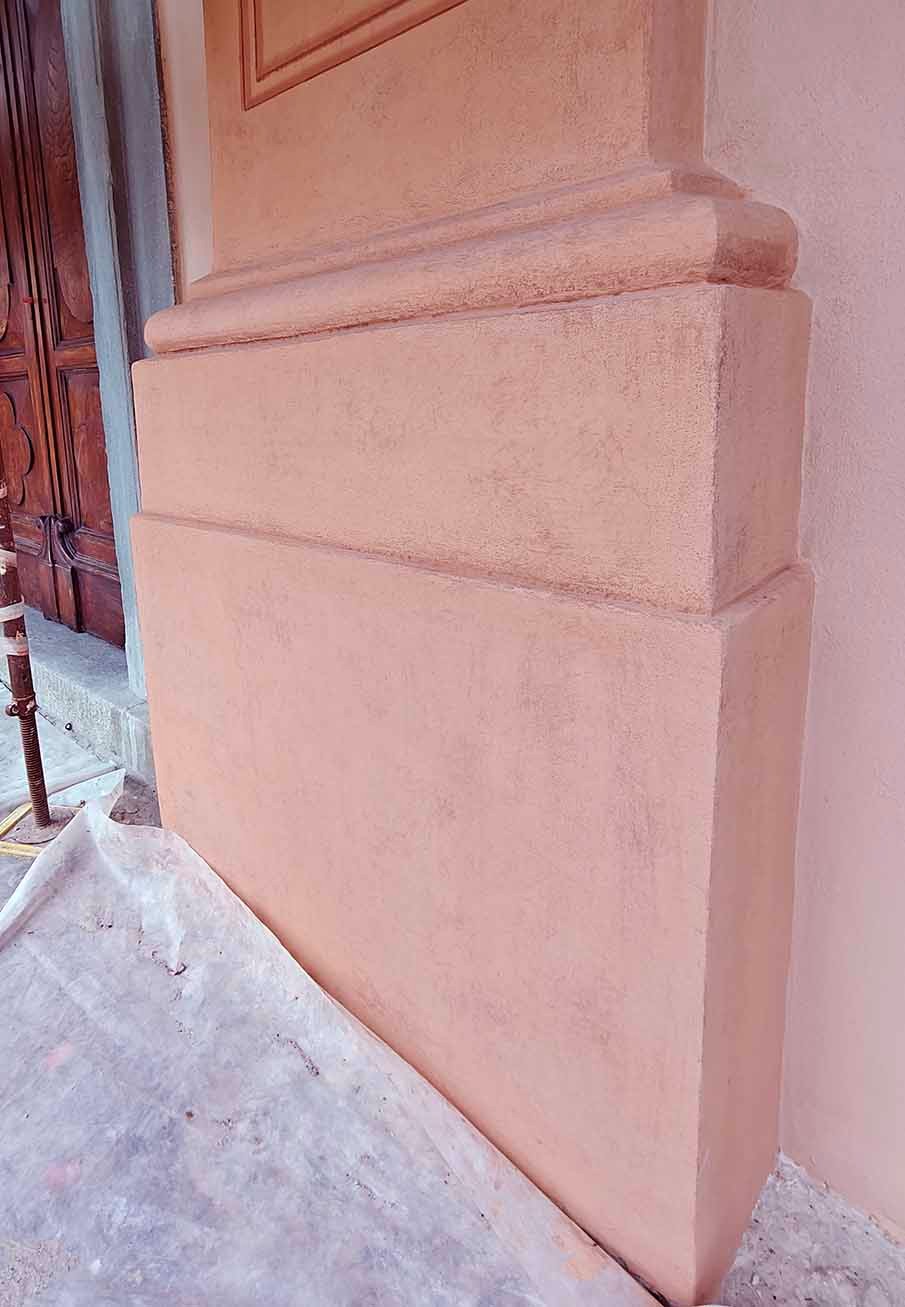 Per la finitura cromatica della facciata è stata utilizzata una tinteggiatura a base di calce, riproposta nelle cromie originali integrata con terre ed ossidi naturali. Le paraste sono state leggermente patinate per uniformare le zone nuove con i frammenti originali e con la decorazione già presente in facciata. Le finestre centrali della facciata, dopo il risanamento delle loro murature e architravature notevolmente deteriorate dai Sali presenti, sono state completamente restaurate e riproposte nei toni e nelle cromie originali.