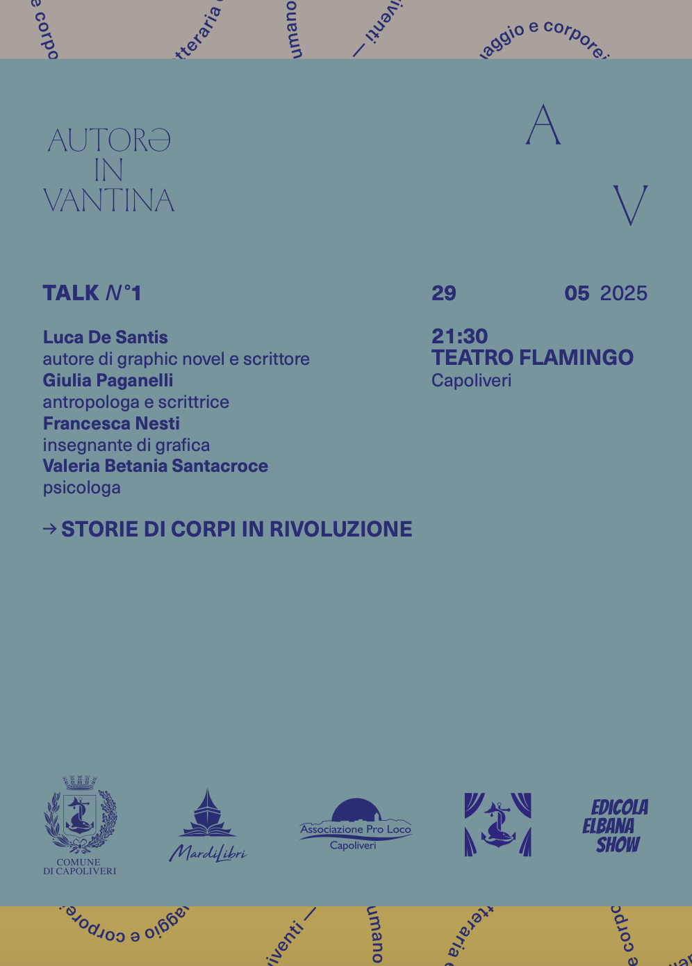 Il programma completo verrà presentato giovedì 29 maggio alle ore 21:30 presso il “Flamingo” di Capoliveri. Si svolgerà contestualmente il primo incontro della rassegna, che avrà come tema “Storie di corpi in rivoluzione”. Quattro saranno i partecipanti a questa prima tavola rotonda: Luca de Santis, pluripremiato autore di graphic novel ed esponente della comunità LGBTQIA+ italiana; Giulia Paganelli, autrice impegnata nell’analisi delle discriminazioni relative alle corporeità non conformi; Francesca Nesti, insegnante, responsabile del progetto PCTO con la V classe a indirizzo Grafica e Comunicazione dell’Istituto “Cerboni” di Portoferraio (durante il quale è stata realizzata una graphic novel tratta dall’antologia “Corpi ribelli” a cura di G. Paganelli – Sperling & Kupfer 2023); Valeria Betania Santacroce, psicologa.