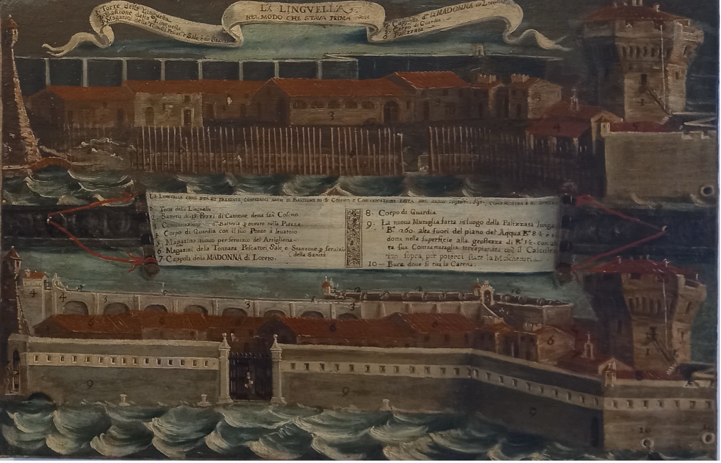 Questa evoluzione della fortificazione,nella darsena, è ben documentato in un dipinto, olio su tela, dove nella parte superiore è la Linguella come stava e nella parte inferiore come sta dopo le nuove fortificazioni avvenute alla fine del seicento tra cui la edificazione della muraglia in sostituzione della palizzata.