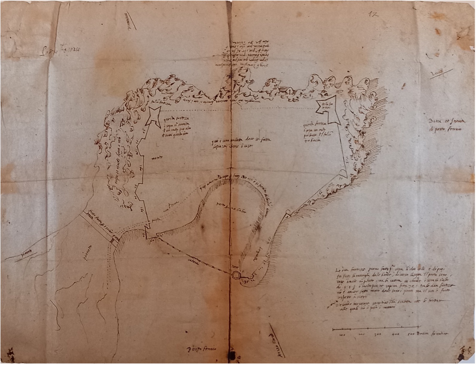 1552, 15 febbraio . Cuppano scrive al Duca che la cortina dalla porta al Falcone “è condotta alla grossezza che ha da essere”; che anche il baluardo della “Linguella è alla perfezione della grossezza e altezza del cordone”; che mancano soldi e la catena va avanti ferrando pali