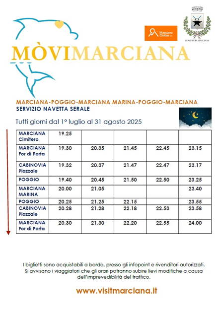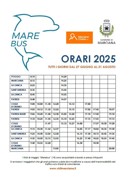 Per ulteriori informazioni sugli orari e le fermate, si invita la cittadinanza a consultare il sito: www.visitmarciana.it.