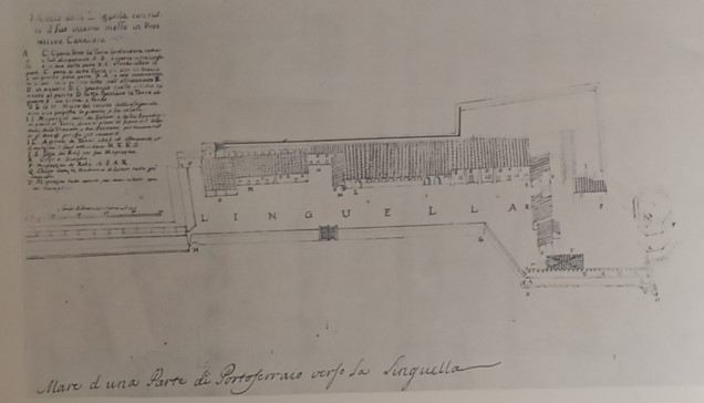 (Portoferraio .LINGUELLA,”Pianta che dimostra la restaurazione e riduzione da farsi a tutta la parte che bagna il mare”Disegno a china acquerellato.Seconda metà del settecento,Cartella 15, Carta 1046.Istituto storico e di cuktura dell’ arma del genio. Roma. Il fossato d’acqua marina della Linguella è ben individuato in questa mappa databile alla seconda metà del sec. XVIII .Con la lettera D è chiamato il “Fosso della Linguella” con la lettera E “altra comunicazione di detto fosso col Mare”con la lettera F”Nuova Porta Segreta”.)