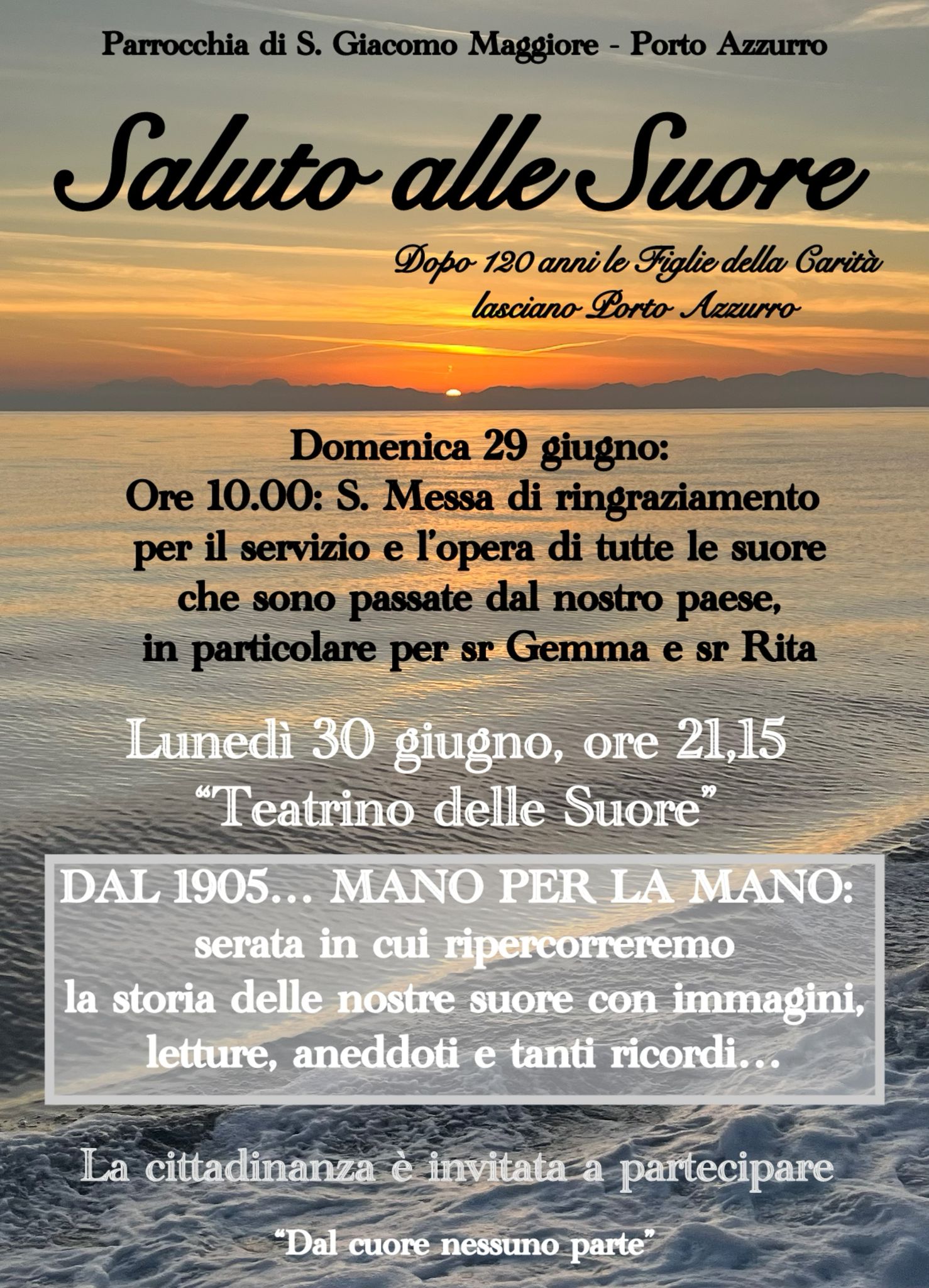È prevista per lunedì 30 giugno, alle ore 21.15, presso il “Teatrino”, la serata-tributo alle Figlie della Carità, le suore che per 120 anni sono state parte attiva del tessuto sociale di Porto Azzurro. “Dal 1905… mano nella mano”: un incontro pensato e voluto proprio nel locale che porta il loro nome, antica sede dell’asilo (prima che le religiose si spostassero al “Poggetto”). Un’iniziativa doverosa durante la quale tutto il paese saluterà in un lungo abbraccio suor Gemma e suor Rita prima che lascino la “casa” verso la nuova missione a cui sono chiamate: una a Roma, l’altra a Cinisello Balsamo (MI).