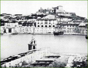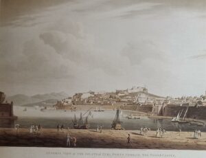 (Veduta di Portoferraio, Inizio ottocento. A.S. Terreni . Incisione di Bubourg del 1814.